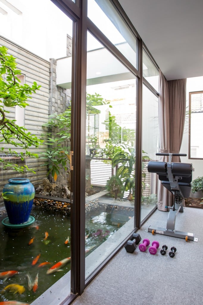 Với hồ/bể cá Koi bằng xi măng thì không có vị trí nào hợp lý hơn chân cầu thang hoặc hồ âm mặt kính cường lực sát cạnh cửa ra vào.