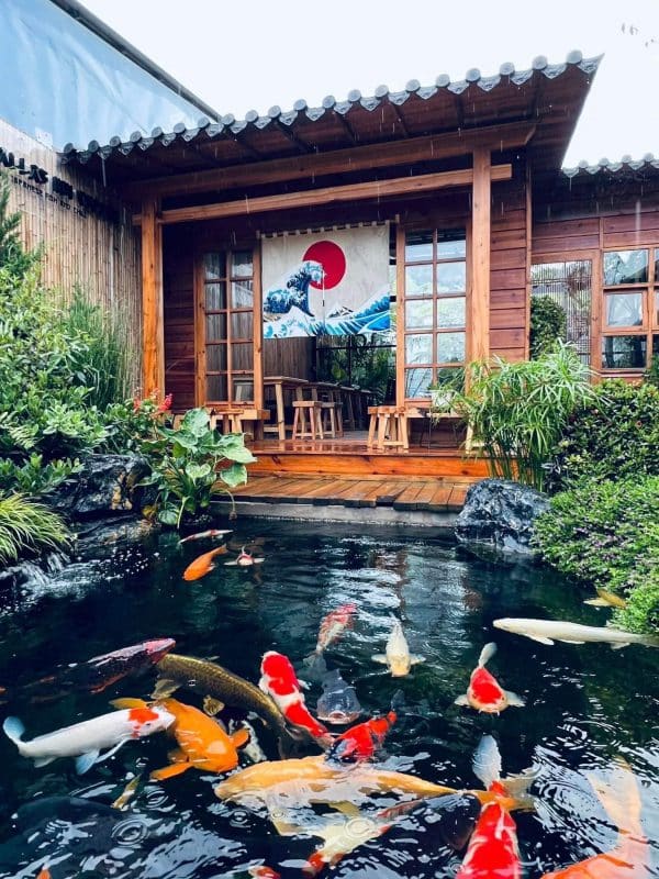 Hồ koi truyền thống Nhật Bản gắn liền với vườn Nhật, xung quanh hồ koi chủ yếu là đá tảng lớn, hồ koi giống như một thiên đường ẩn khuất trong rừng đá và cây xanh